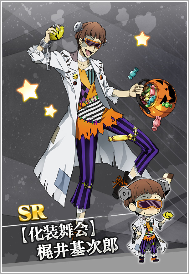 作为武装侦探社的最强大脑,后篇的SSR之一就是我们的江户川乱步啦。装扮成骑着飞天扫帚的男巫,配合乱步桑标志性的眯眯眼表情,依然是让人有些捉摸不透他内心的想法。不管是手上拿的还是小南瓜里装着的,都有大把大把的糖果,看来他在今年的万圣夜也是战果斐然呢~